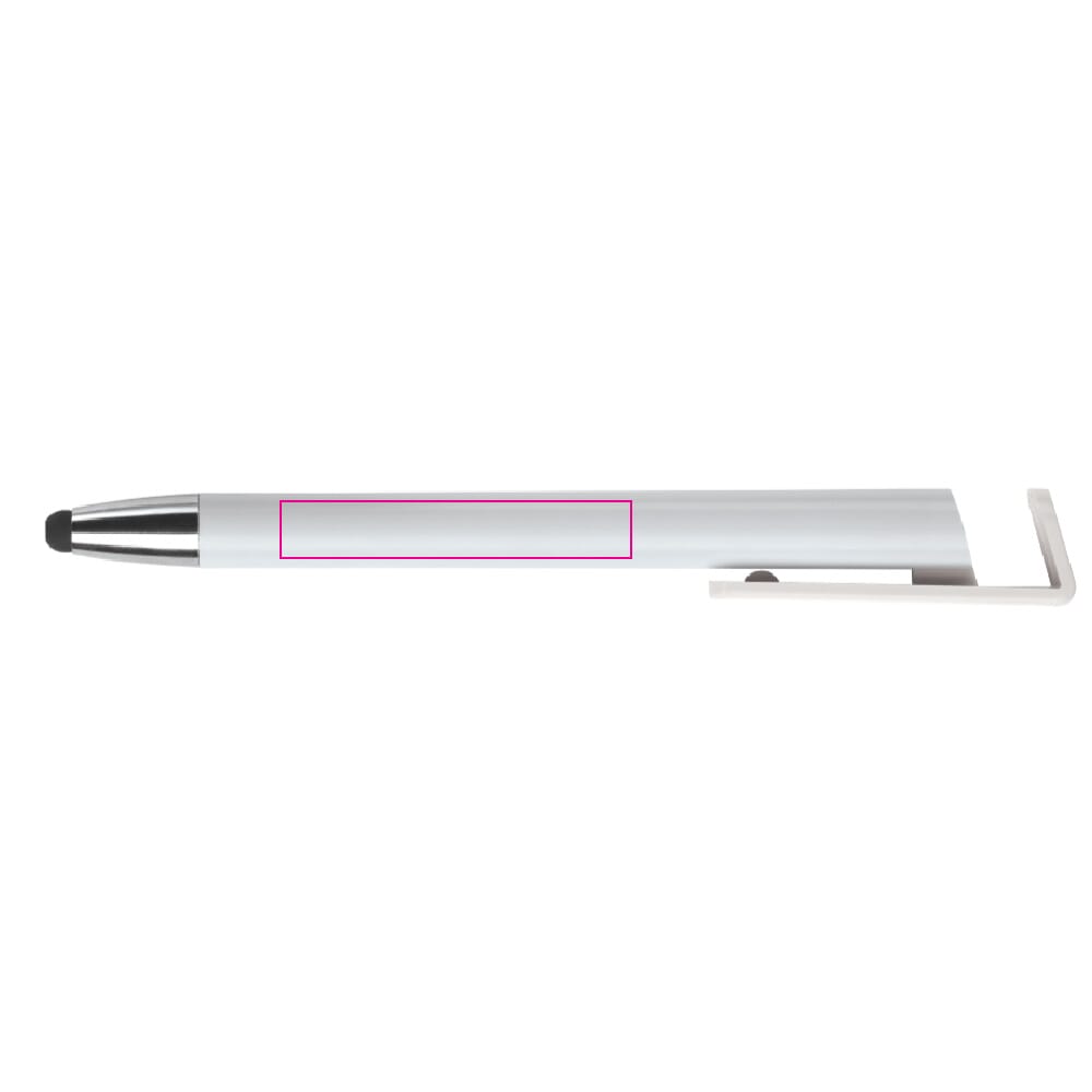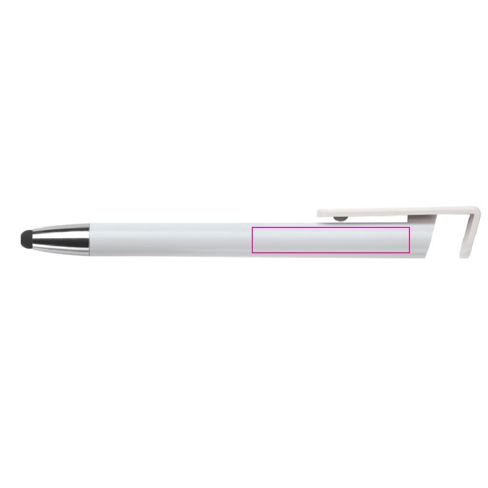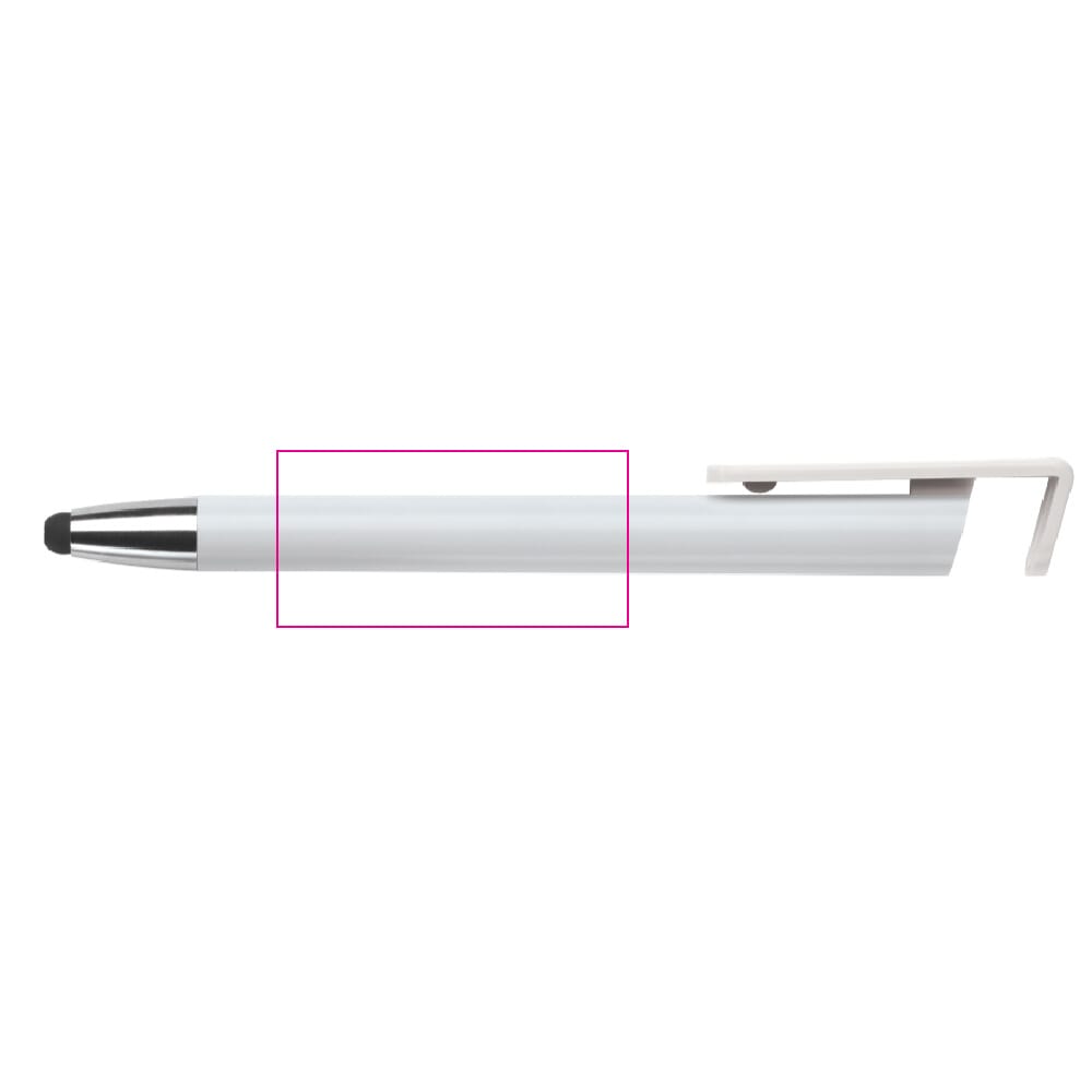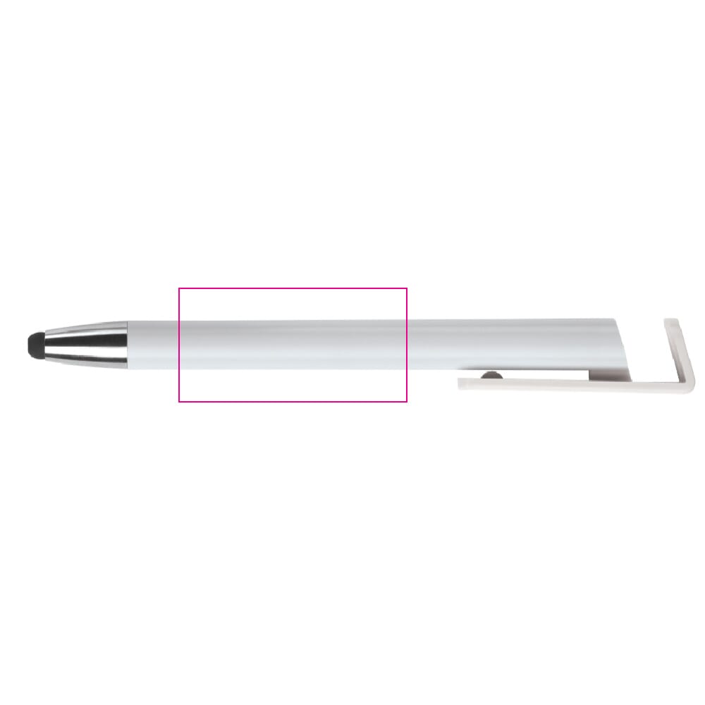 Ein moderner 3-in-1-Kugelschreiber mit Stylus und Telefonhalter. Ein sehr schönes Give Away in einem glatten Design. Blauschreibend.