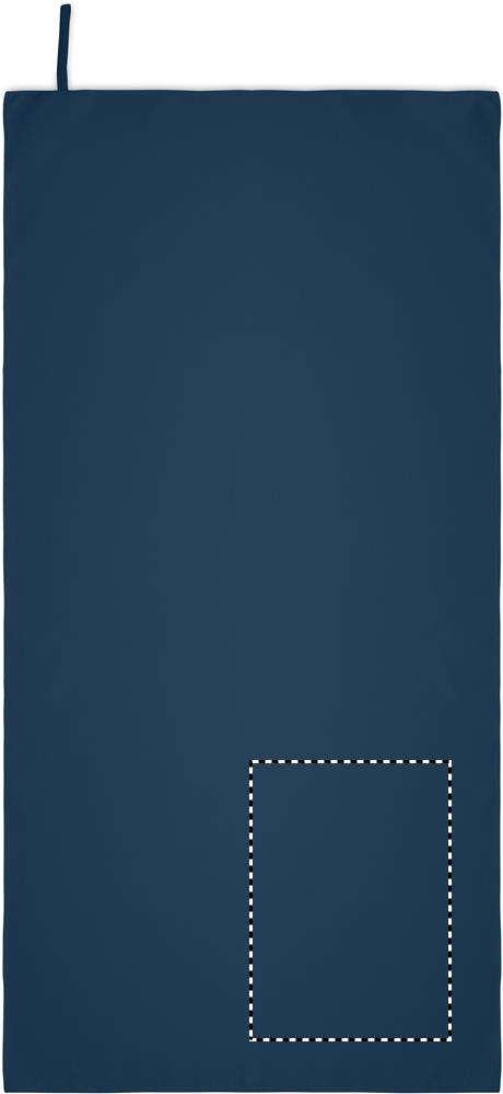 Handtuch aus Mikrofaser. 90% Polyester und 10% Polyamid mit Elastikschlaufe. Leicht und schnell trocknend. Maße: 50 x 100 cm.