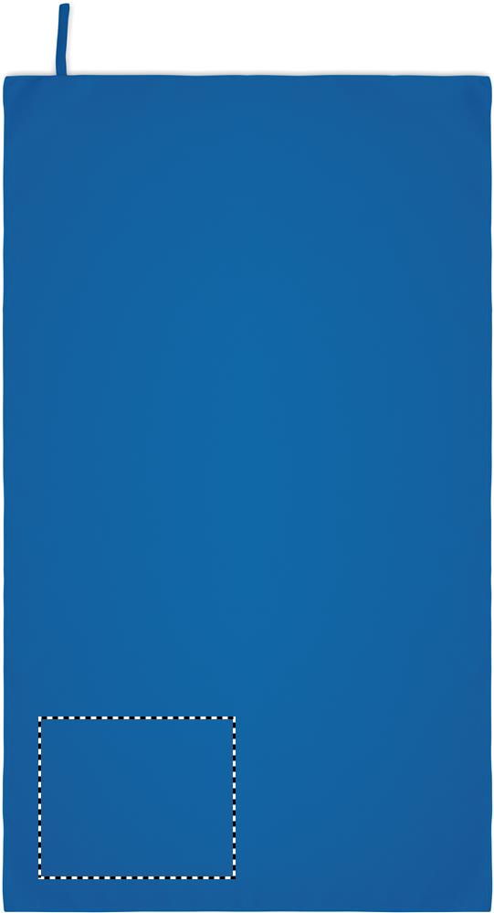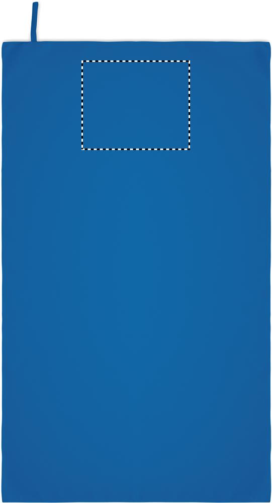 Handtuch aus Mikrofaser. 90% Polyester und 10% Polyamid mit Elastikschlaufe. Leicht und schnell trocknend. Maße: 70 x 120 cm.