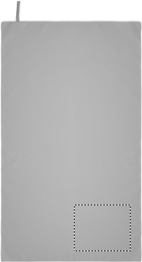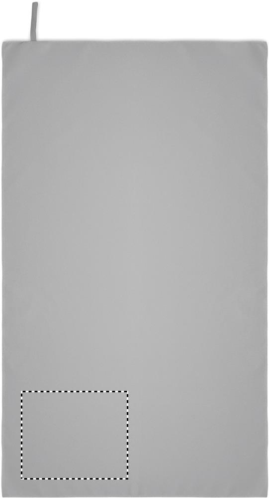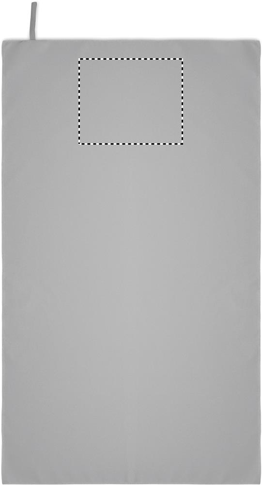 Handtuch aus Mikrofaser. 90% Polyester und 10% Polyamid mit Elastikschlaufe. Leicht und schnell trocknend. Maße: 70 x 120 cm.