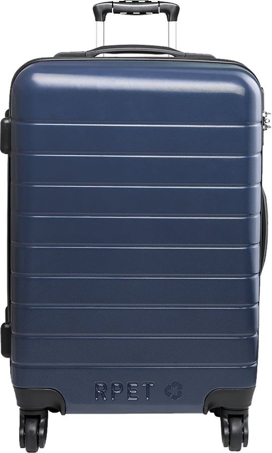 RPET Trolleytasche aus Kunststoff mit 4 Doppelrollen, Teleskopgriff und TSA-Zahlenschloss. Mit RPET-Innenfutter und elastischen Befestigungsbändern. Mit RPET-Label.