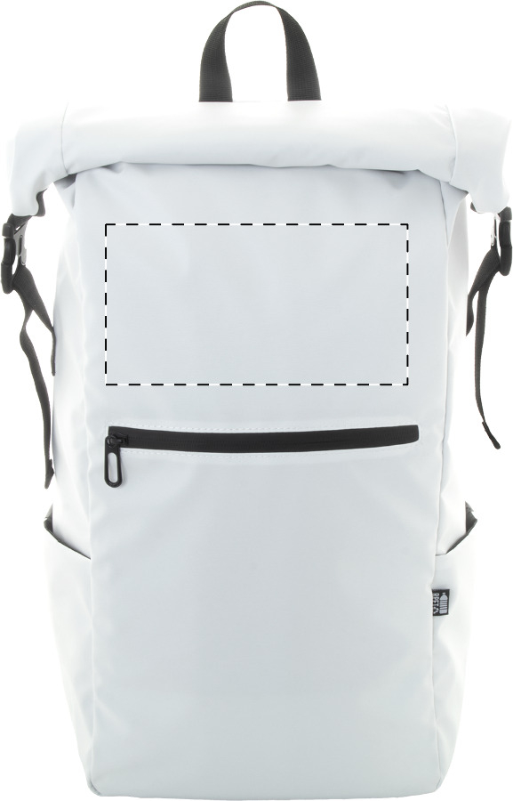 Wasserdichter Rolltop-Rucksack aus RPET mit Schnalle und Klettverschluss, gepolstertem Laptop- (16") und Tabletfach (10"), Reißverschlusstasche vorne, Seitentaschen, gepolstertem Rücken und Schultergurten. Material: PU beschichtetes 600D RPET-Polyester. Mit RPET-Label.