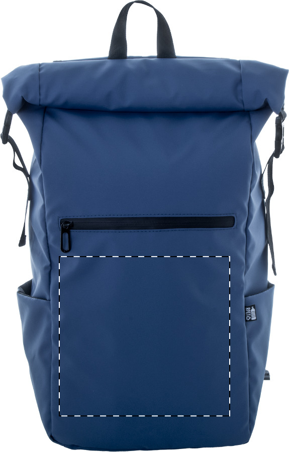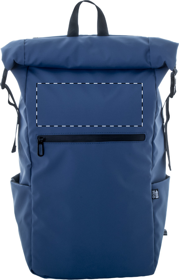 Wasserdichter Rolltop-Rucksack aus RPET mit Schnalle und Klettverschluss, gepolstertem Laptop- (16") und Tabletfach (10"), Reißverschlusstasche vorne, Seitentaschen, gepolstertem Rücken und Schultergurten. Material: PU beschichtetes 600D RPET-Polyester. Mit RPET-Label.