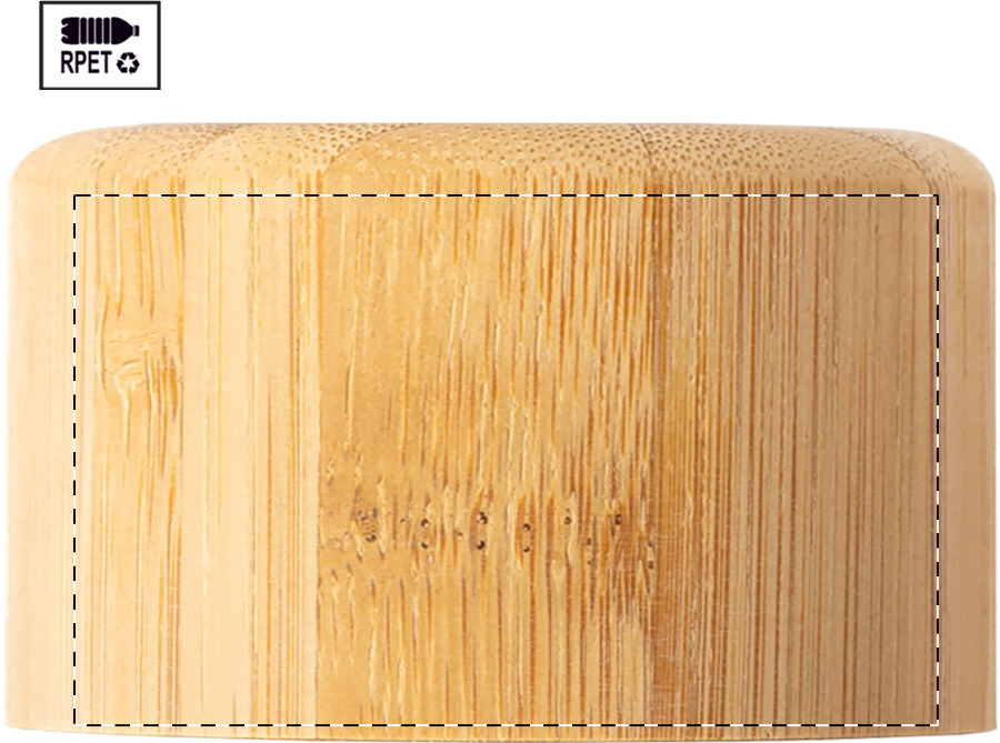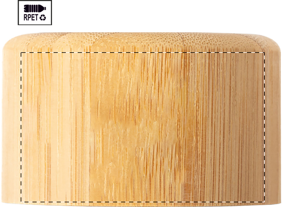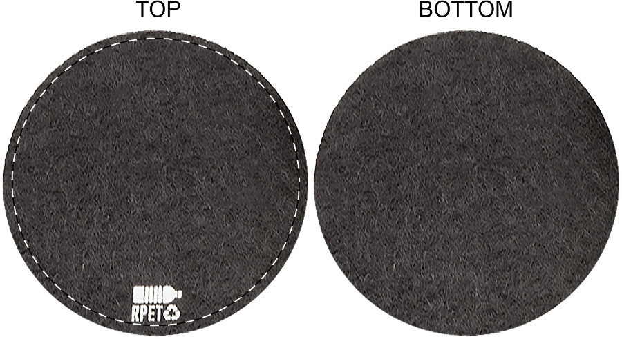 10-teiliges Untersetzer-Set aus RPET Filz in einem Spender aus Bambus und RPET-Logo auf jedem Untersetzer.