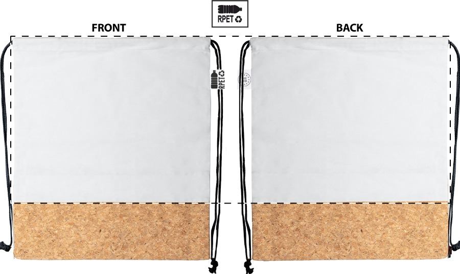 Individueller Turnbeutel mit Kordelzug. Material: 600D RPET Polyester und Naturkork. Der Preis ist inkl. Sublimationsdruck und RPET-Label. Mindestmenge: 25 Stk