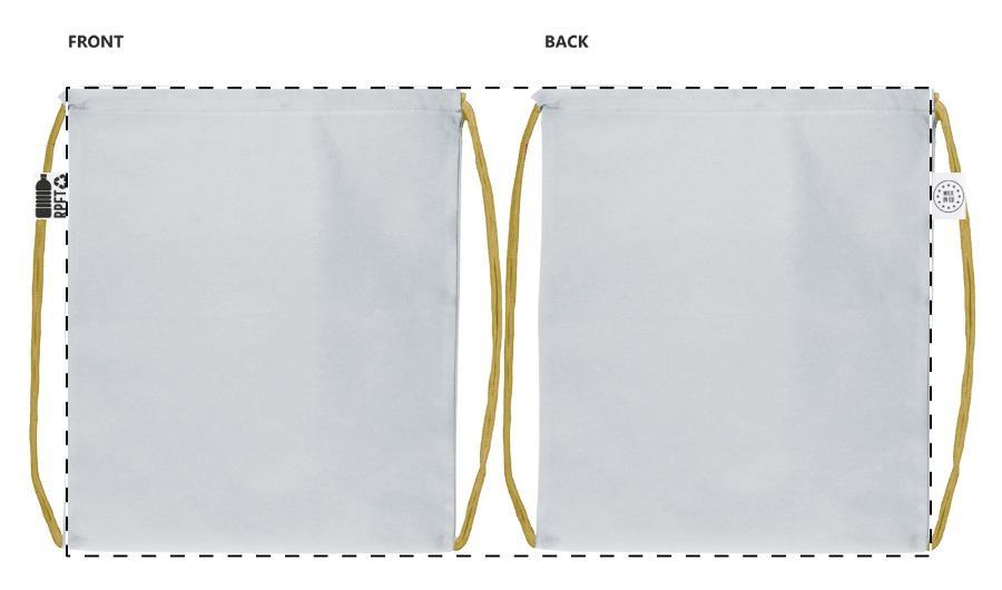 Individueller Turnbeutel für Kinder, mit farbigen Zugkordeln, Material: 190T RPET Polyester. Der Preis ist inkl. vollflächigem Sublimationsdruck sowie RPET-Label. Mindestmenge: 25 Stk.