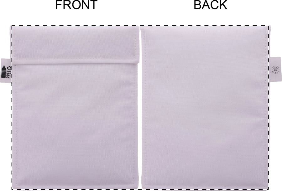 IIndividuelle wiederverwendbare Snacktasche aus 600D RPET Polyester mit strapazierfähigem wasserdichtem Futter und Klettverschluss. Ideal zum Einwickeln von Snacks oder Sandwiches. Der Preis ist inkl. vollflächigem Sublimationsdruck. Mindestmenge: 25 Stk.
