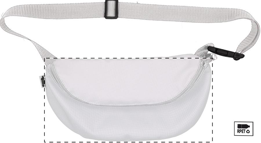 Individuelle Gürteltasche mit Reißverschlussfach und Fach mit RFID-Schutz, Material: 600D RPET Polyester. Der Preis ist inkl. Sublimationsdruck und RPET-Label. Mindestmenge: 25 Stk.