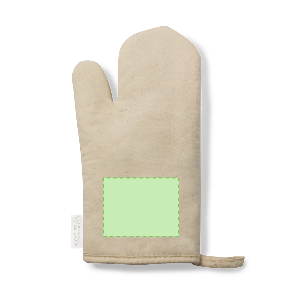 Linie Natur Küchenhandschuh. Hergestellt aus hochwertigem Material aus recycelter Baumwolle. Mit einer glatten Seite zum Bedrucken und einem Band zum Aufhängen. Unverwechselbares Etikett für recycelte Baumwolle.