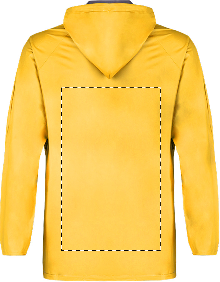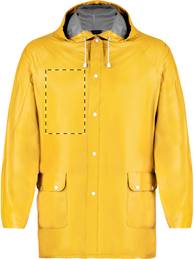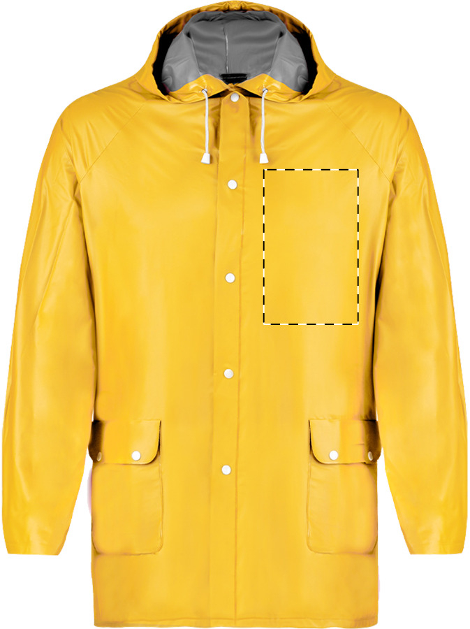 Regenjacke mit Kapuze aus widerstandsfähigem PVC mit versiegelter Oberflächenbeschichtung, Druckknopfverschluss und 2 Außentaschen.