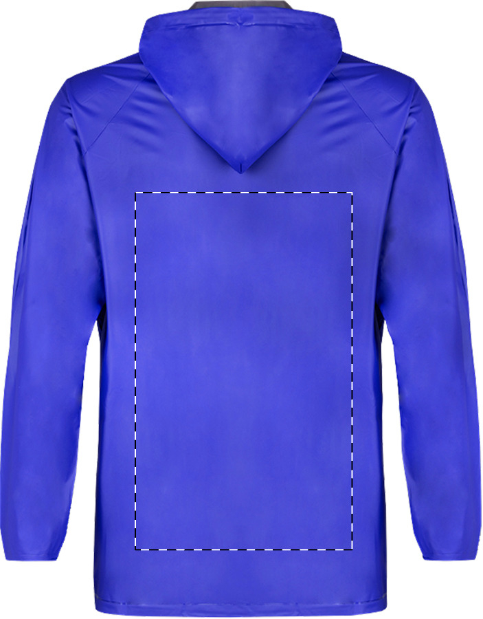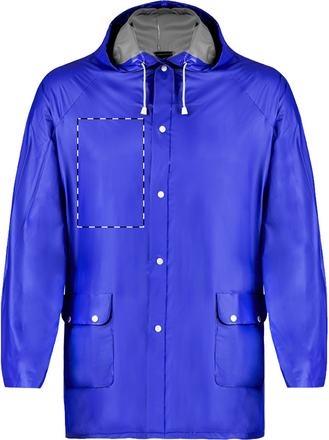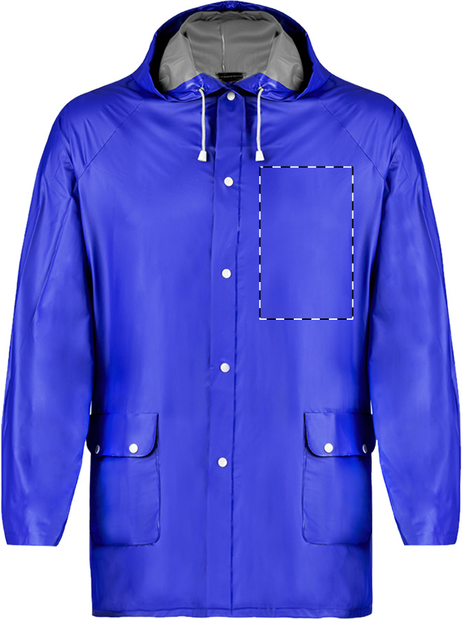 Regenjacke mit Kapuze aus widerstandsfähigem PVC mit versiegelter Oberflächenbeschichtung, Druckknopfverschluss und 2 Außentaschen.