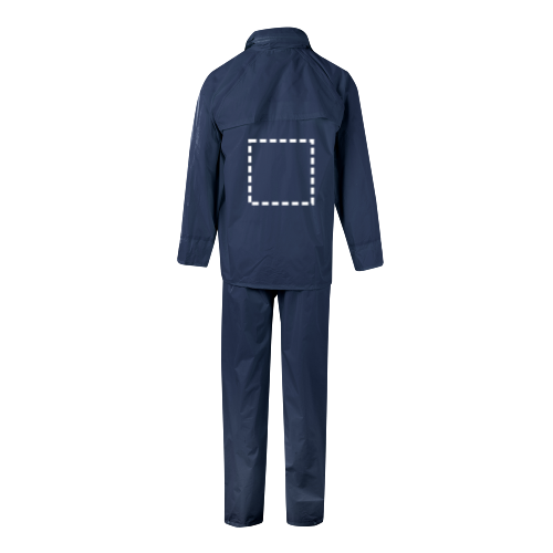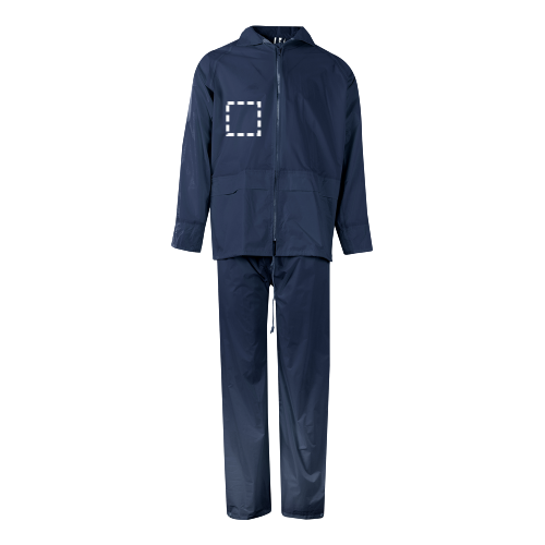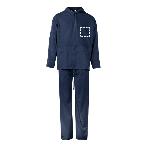 Regenanzug (225g/m²), zweiteilig aus Polyester (100%) mit PVC-Beschichtung.Jacke, mit zentralem Reißverschluss, mit Kapuze im Kragen, elastische Innenbündchen, Innennetz auf dem Rücken und Metallösen in den Achselhöhlen, um die Atmungsaktivität zu fördern, mit zwei Taschen (2 untere Taschen, mit Klappe verdeckt).Hose: zentraler Reißverschluss mit Knöpfen, elastischer Bund, mit verstellbaren Knöpfen an der Unterseite, seitliche Öffnungen mit Lasche für den Zugang zu den Taschen. Größe: M, L, XL, 2XL, 3XL