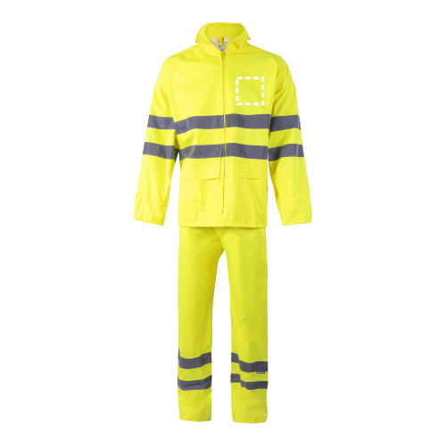 Regenanzug (130g/m²), aus Polyester (100%) mit PU-Beschichtung.Jacke mit zentralem Reißverschluss, Reflektorstreifen an Rumpf und Ärmeln und versteckter Kapuze im Kragen. Das innere Netzgewebe ist aus Polyester (100%) und die Metallösen fördern die Atmungsaktivität. Die Jacke ist mit einem Stopper verstellbar und hat 2 versteckte untere Taschen mit Klappe.Hose: elastischer Bund und Knopfverschluss. Mit Reflexstreifen an der Unterseite der Hose und seitlichen Öffnungen mit Klappe für den Zugang zu den Taschen. Mit verstellbaren Knöpfen an der Unterseite. Produkt gemäß EU-Verordnung 2016/425, zertifiziert nach EN20471 und Klasse Nº 3. Größe: M, L, XL, 2XL, 3XL