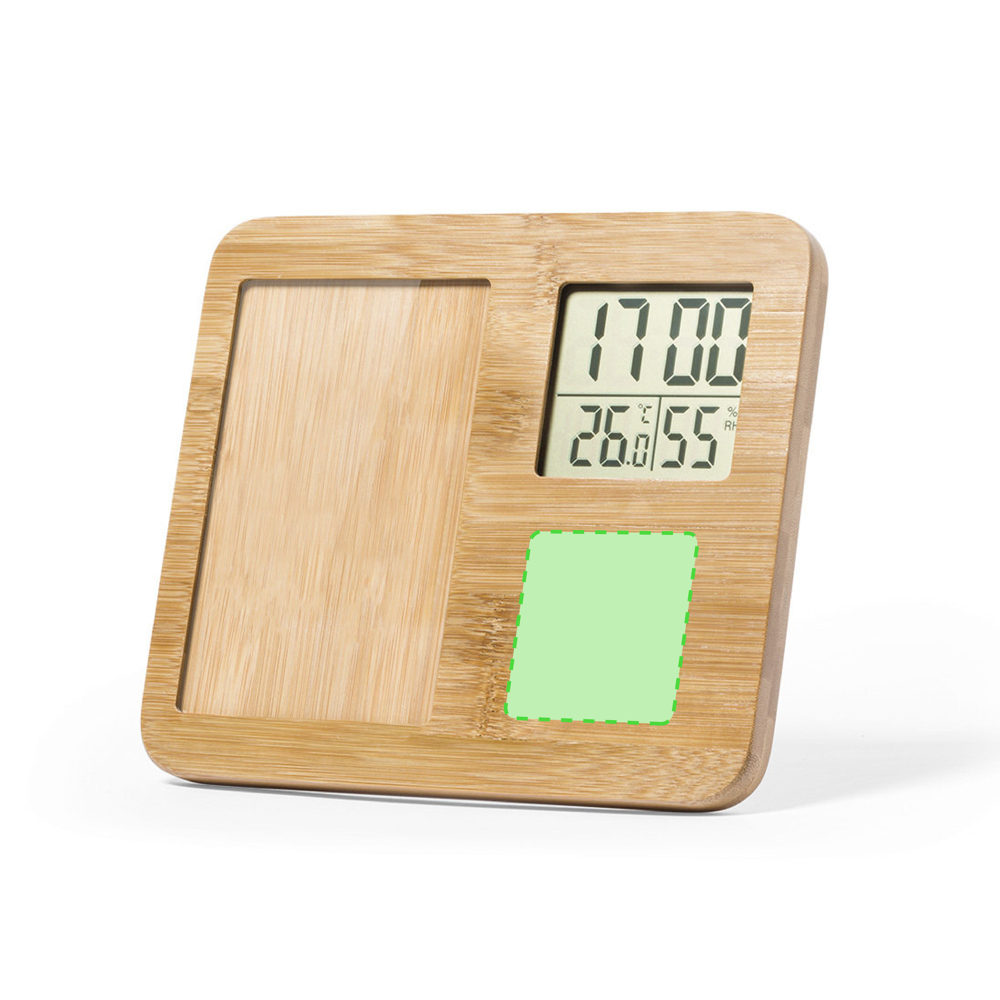 Linie "Natur" Fotorahmen aus poliertem Bambus, mit integrierter Wetterstation und den Funktionen Thermometer, Hygrometer und Uhr. Geeignet für Fotos im Format 9x14cm und mit batteriebetriebener Uhr (Knopfzellen enthalten). Präsentiert in einer attraktiven Öko-Design-Box. Gebrauchsanweisung in Englisch und Spanisch erhältlich.